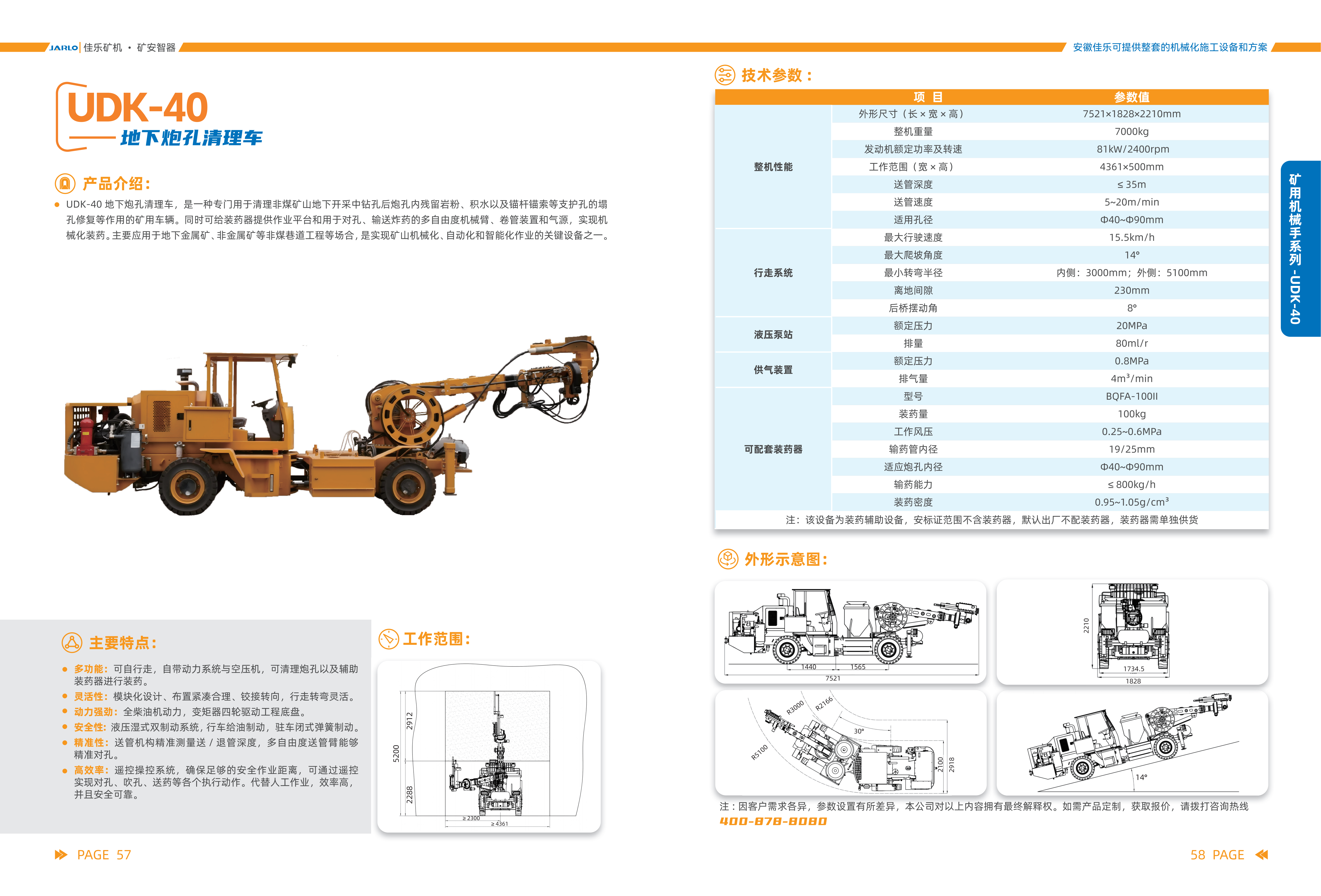 UDK-40地下炮孔清理車,是一種專門用于清理非煤礦山地下開采中鉆孔后炮孔內殘留巖粉、積水以及錨桿錨索等支護孔的塌孔修復等作用的礦用車輛。同時可給裝藥器提供作業平臺和用于對孔、輸送炸藥的多自由度機械臂、卷管裝置和氣源,實現機械化裝藥。主要應用于地下金屬礦、非金屬礦等非煤巷道工程等場合,是實現礦山機械化、自動化和智能化作業的關鍵設備之一。